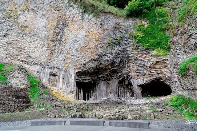約160万年前の火山活動で生まれた六角柱状の玄武岩が並ぶ国指定天然記念物。